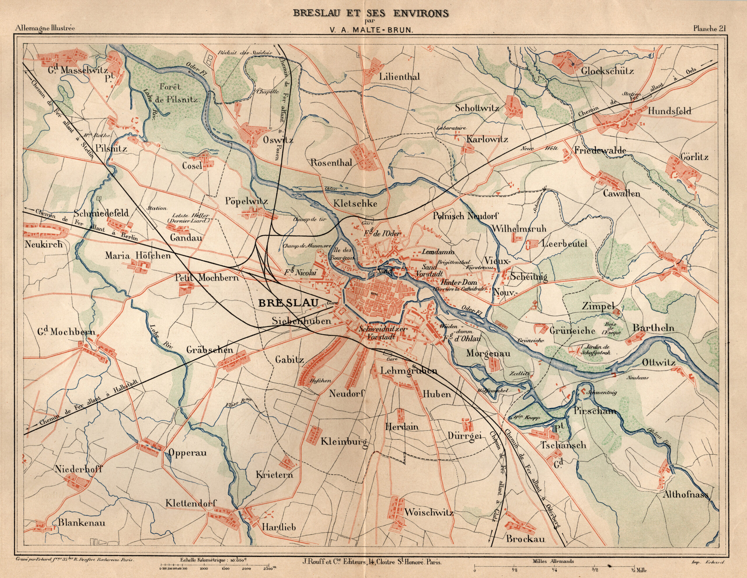 Karte Breslau und Umgebung; Ottwitz ist am rechten Bildrand in der Mitte zu sehen (1885) Quelle: https://www.abebooks.de/karten/Litho.–Karte-Farblitho-Malte-Brun-Breslau-environs/30133493679/bd