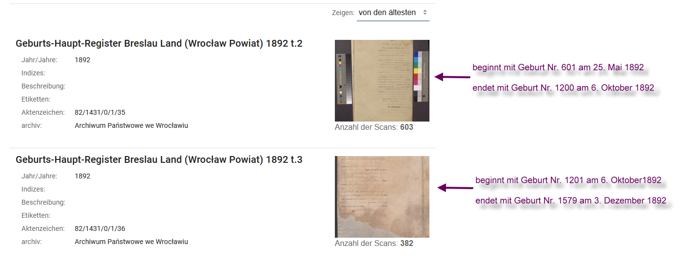 Die Suche auf der Archivwebseite https://www.szukajwarchiwach.gov.pl/de/wyszukiwarka liefert für den Suchbegriff „Geburts-Haupt-Register Breslau Land (Wrocław Powiat) 1892“ zwei 2019 digitalisierte Bände, die die Monate Mai bis Dezember 1892 vollständig abdecken. Für den zu untersuchenden Zeitraum liegen also lückenlose Geburtsregister des zuständigen Standesamtes vor.