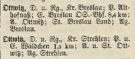 Um eine mögliche Umbenennung auszuschließen, wurde das Schlesischen Ortschaftsverzeichnis von 1881 eingesehen, das ebenfalls nur die beiden o. G. Orte mit dem Namen Ottwitz auflistet.