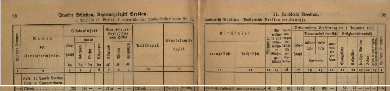 Für Ottwitz hatte es ab dem 01. Oktober 1874, gesichert aber ab dem 06. Februar 1875 ein eigenständiges Standesamt gegeben. Ab 1878 war das Standesamt „Breslau-Landbezirk“ oder kurz „Breslau-Land“ zuständig. Diese Information konnten wir schließlich auf dieser Seite im Internetarchiv http://www.breslau-wroclaw.de/de/breslau/source/standesamt/ verifizieren.